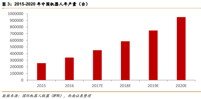 目前全球正在使用的工业机器人已经超过 150 万台,到 2018 年,这一数据预计将突破230 万台,其中 140 万台在亚洲。亚洲是全球工业机器人近几年及未来增长的主要驱动因素,世界机器人联盟(IFR)预测,到 2020 年亚洲机器人产量将达到 190 万台,其中中国机器人年产量将达到 95 万台,中国在世界工业机器人产量占比将达到 40%。据 IFR 统计,自 2013年以来,中国已连续五年成为全球第一大机器人消费国。