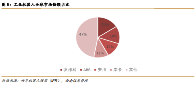 “它山之石,可以攻玉”:虽然我国已经成为全球最大的工业机器人消费市场,但从全球角度看,目前欧洲和日本是工业机器人主要供应商,ABB、库卡(KUKA)、发那科(FANUC)、安川电机(YASKAWA)四家公司占据着工业机器人 53%的市场份额。